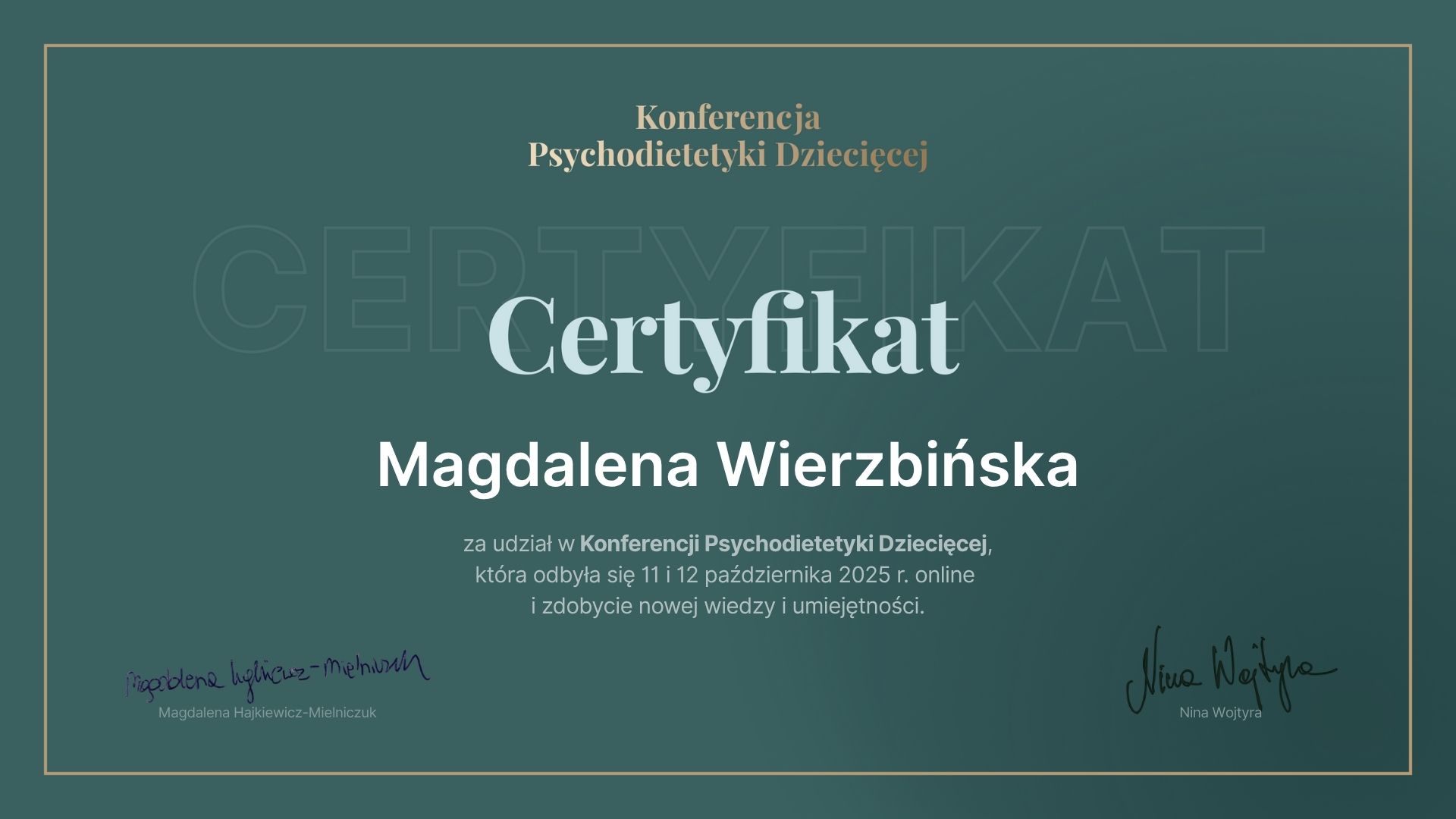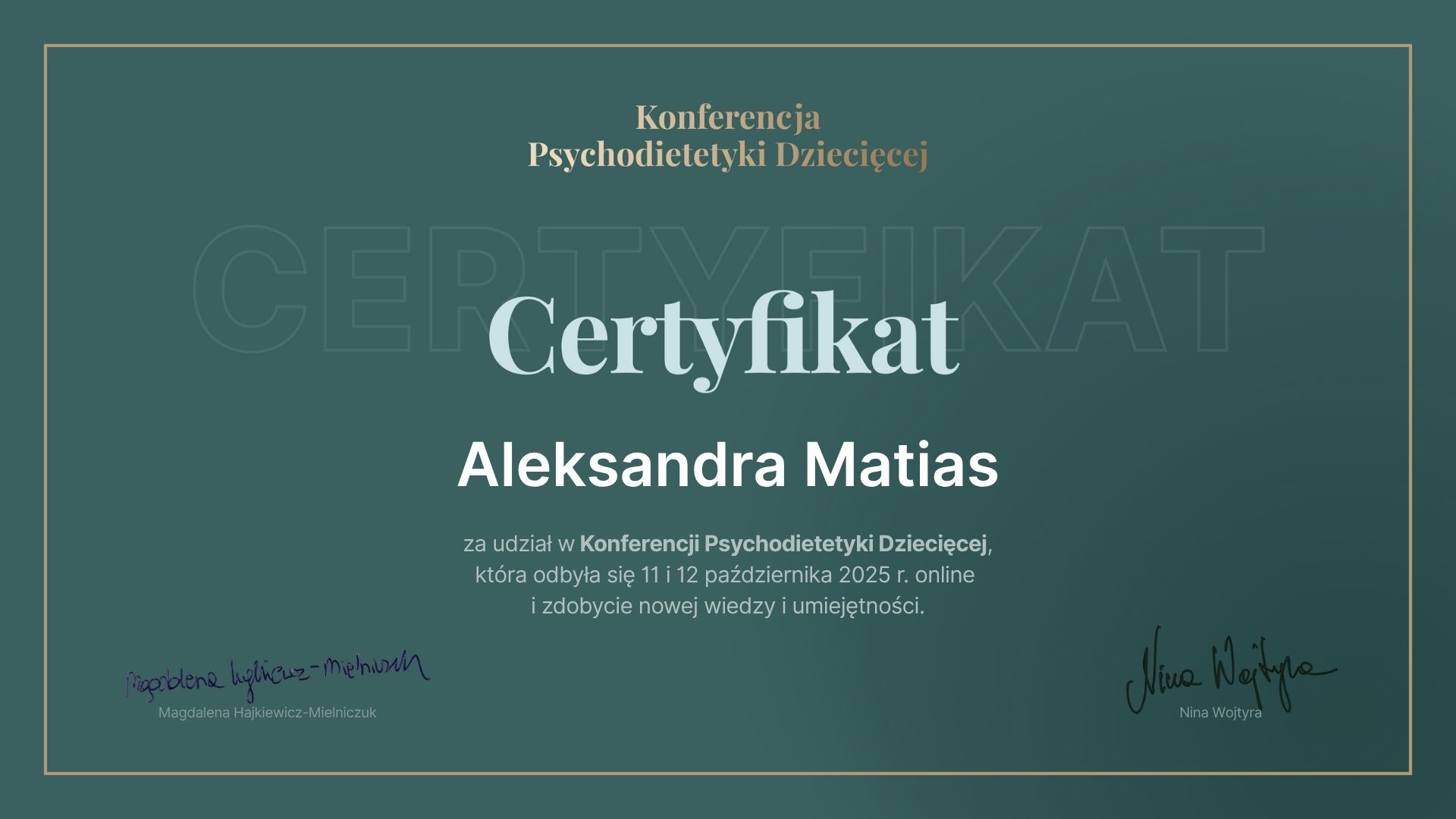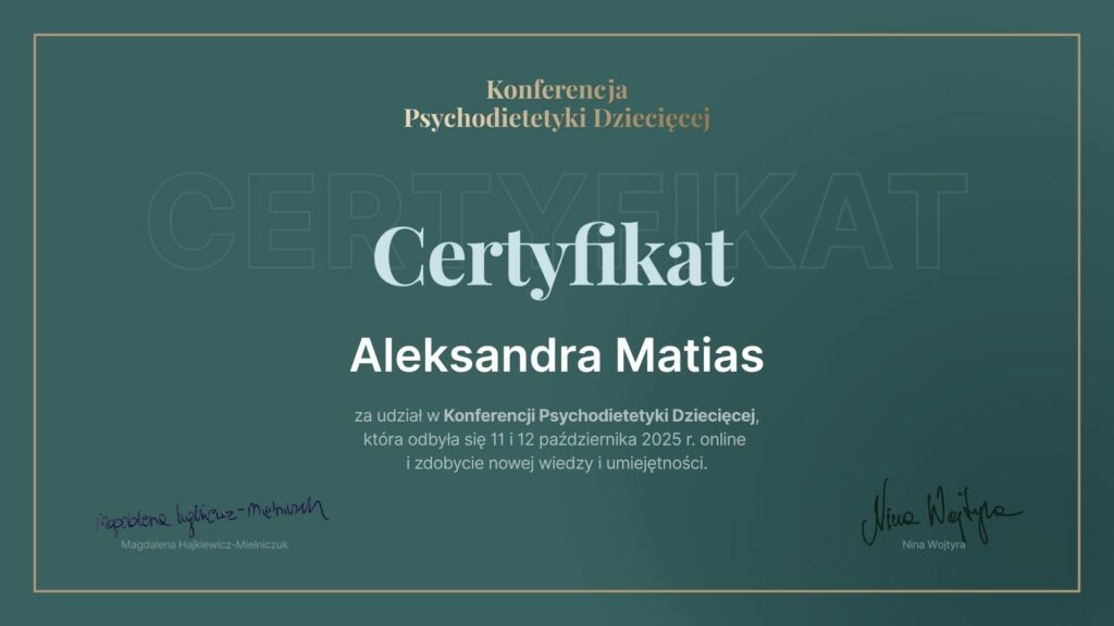 specjalnościach dietetyki klinicznej i psychodietetyki. Ukończyłam studia na Śląskim Uniwersytecie Medycznym oraz na Warszawskim Uniwersytecie Medycznym. Stale poszerzam swoją wiedzę i kompetencje przez uczestnictwo w wielu konferencjach i szkoleniach.