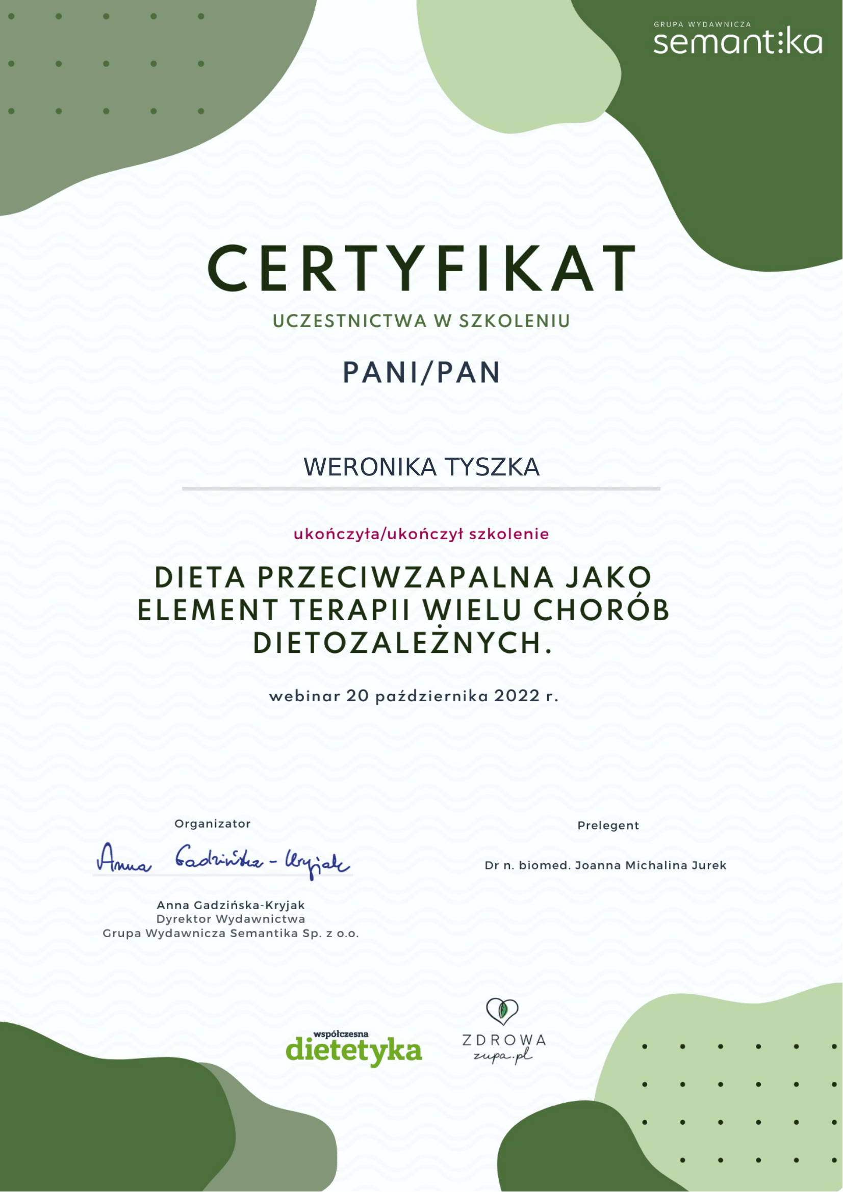 Bardzo spodobały mi się zmiany zachowań żywieniowych! Super! Oczywiście poleciłabym współpracę z Tobą! Widząc po przygotowanych materiałach jest się pewnym, że ma się do czynienia z osobą kompetentną i ma się pewność, że jest się w bezpiecznych rękach. Polecam!