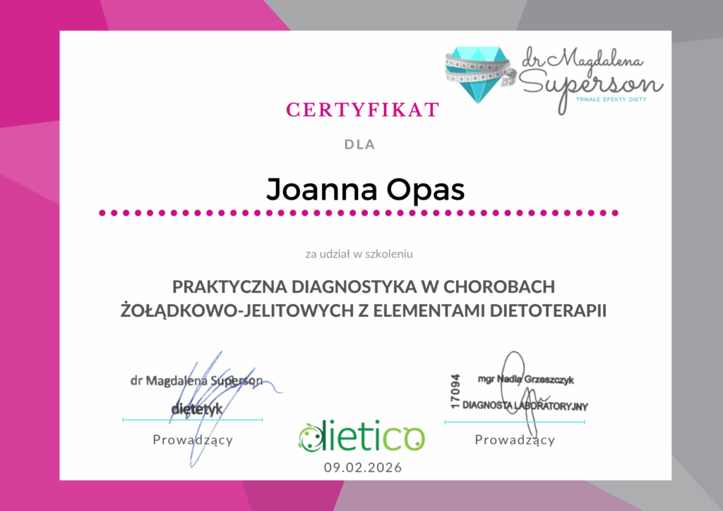 Jako magister dietetyki i dietetyk pracujący w szpitalu Olsztynie, mam doświadczenie w pracy z pacjentami wymagającymi indywidualizacji zaleceń. Stale rozwijam swoją wiedzę, uczestnicząc w szkoleniach i konferencjach, dzięki czemu moja praca opiera się na aktualnych wytycznych i sprawdzonych badaniach naukowych.